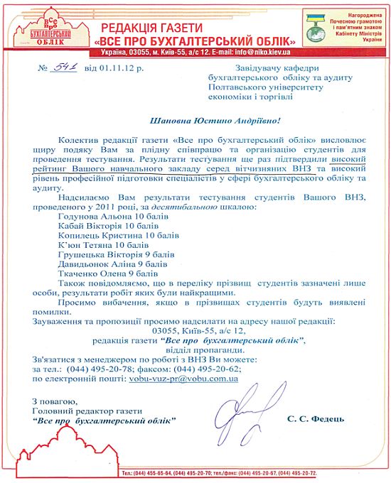 12 січня 2011 року кафедрою бухгалтерського обліку і аудиту проведено семінар-нараду з методики складання річної фінансової звітності за 2010 рік для головних бухгалтерів споживчих товариств районних спілок, підприємств та організацій Полтавської облспоживспілки.