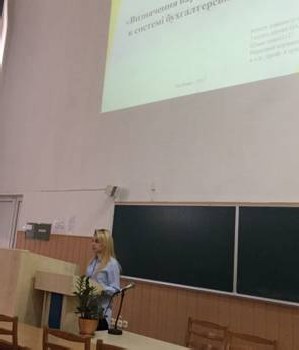 Виступ з доповіддю на тему „Особливості інформаційного забезпечення процесу прийняття довгострокових інвестиційних рішень” старшого викладача кафедри бухгалтерського обліку і аудиту, сертифікованого бухгалтера-практика за міжнародною програмою сертифікації бухгалтерів СІРА Любимова М О.